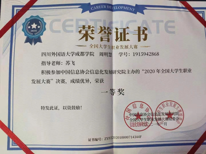 近日,由中国信息协会信息化发展研究院举办的全国大学生职业发展大赛获奖名单揭晓,开云APP(中国)官方下载 西欧语言学院2019级葡萄牙语1班周明慧同学在苏飞老师的指导下,经过初赛和决赛的激烈比拼,最终荣获全国一等奖。