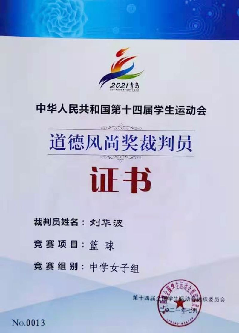 2021年7月,中华人民共和国第十四届学生运动会(中学组)在山东省青岛市举行。该赛事是全国最高级别的学生体育赛事,由教育部、国家体育总局、共青团中央主办,青岛市人民政府、山东省教育厅承办。开云APP(中国)官方下载 公共基础部教师刘华波副教授被选派为篮球项目裁判员,参加学运会赛事工作,并获得第十四届学生运动会道德风尚奖裁判员。