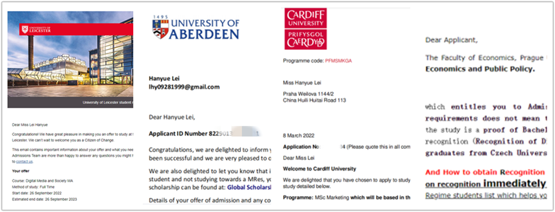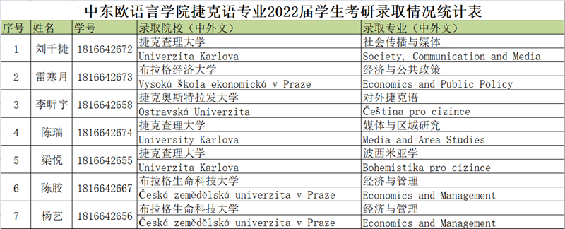 刘千捷同学收到2所知名高校的研究生录取通知书,分别是捷克查理大学和卡迪夫大学,最终学生选择进入捷克查理大学社会传播与媒体专业就读。梁悦同学用捷克语考入了捷克查理大学研究生,免全部学费;李昕宇同学用捷克语考入捷克奥斯特拉发大学对外捷克语研究生专业,免全部学费;以下是捷克语考研学子的录取情况。