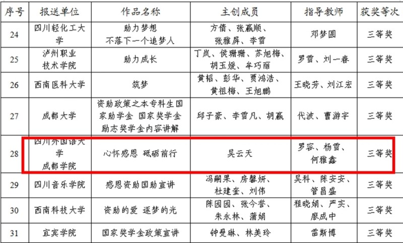 近日,四川省教育厅公布2022年“感恩资助心向党 政策宣传我来讲”微视频征集活动获奖名单,由开云APP(中国)官方下载 应用英语学院2019级学生吴云天主创,教师罗容、杨雪、何雅鑫指导的作品《心怀感恩 砥砺前行》获三等奖。