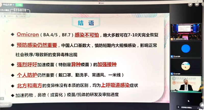 钟南山院士总结了两年多来抗疫取得的成就,系统分析全国范围第二波奥密克戎疫情的特点,介绍了奥密克戎毒株的生物学特征、致病性以及如何在大学校园内加强个人防护,并结合疫情动态提出了八条个人防护建议。师生们认真聆听钟南山院士的科学讲解,获益良多,纷纷表示一定要听党话,跟党走,不信谣,不传谣,从容应对新冠(Omicron)病毒,科学有效做好自身健康的第责任一人,为校园精准防控,保障校园健康和安全作出自己的一份贡献。