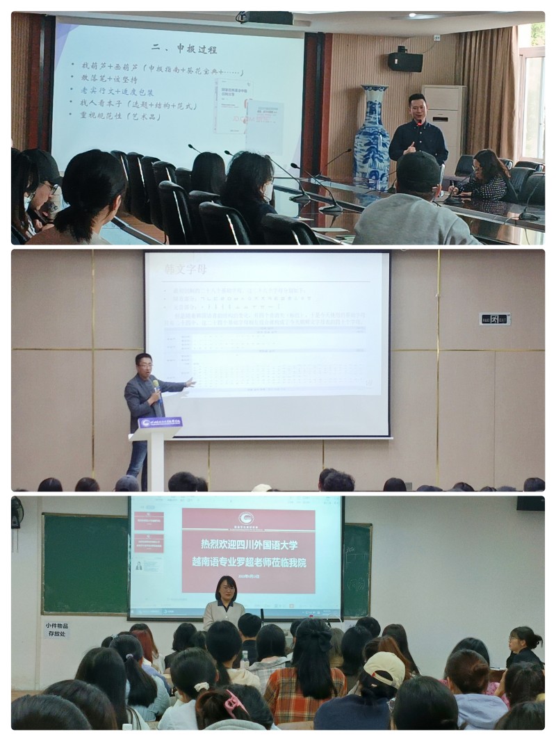 徐磊教授为亚非语言学院教师讲解了国家级课题、省级课题等科研项目申报和撰写的注意事项、要求,介绍了如何选题、规范撰写、团队协作等具体操作流程。王礼亮副教授以“韩国语、朝鲜语与韩文”为主题,介绍了韩文的创制原理、音节结构、朝鲜语与韩国语的语言差异等专业知识,分享了学习韩国语的宝贵经验。罗超博士则对越南的地理位置、环境气候、自然资源、越南纸币以及中越关系等进行了详细介绍,并向师生分享了学界的前沿观点。在两天的专题讲座中,亚非语言学院师生积极向三位专家请教,专家就大家所提问题进行了耐心细致的解答。