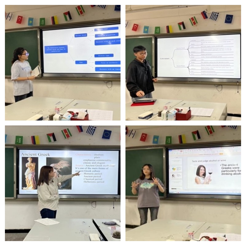 4月24日,应用英语学院2022级国际班“欧洲文化、文学与艺术”课程完成了古代希腊和古罗马帝国相关知识的学习,并组织开展了学习成果展示活动。同学们按照任课教师李丹的要求,根据课本知识和自主收集的资料,围绕文化、艺术、宗教等方面对两个古代帝国进行了对比研究。他们或对两大帝国的建筑主题、特点及社会结构进行梳理阐述,或利用思维导图列出两大帝国在文学成就方面的异同,还有同学通过展示大量图片带领全班同学“身临其境”感受两大帝国的艺术和娱乐方式的差异。