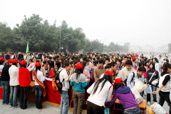 英语师范系一位2006级的新生说:“能尽自己的一点绵薄之力帮助那些受灾的人民,是我最大的心愿。” 英语旅游系2004级的一位同学说:“虽然我们离灾区较远,可是我们与灾区人民的心却紧紧相连,只要我节俭一点,也许就能使他们的生活好过一些!”