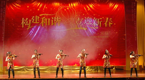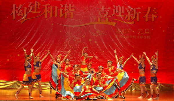 晚会分为“政通人和唱繁荣,和平盛世谱华章”、“瑞舞欢歌禧新年,和谐校园满庭芳”、“团结和睦谋发展,和衷共济创新篇”三章。英语师范系、日语系、西班牙语系表演的《欢庆锣鼓》,以欢乐喜庆、热闹欢腾的舞蹈表达了全院师生欢庆新年的喜悦之情,展现了师生蓬勃向上、精神焕发的良好风貌;学院艺术团戏曲队表演的相声《西征梦》,以梦想的方式表达了对社会和谐有序、世界安定和平的良好祈愿;英语外事管理系表演的舞蹈《天路》,呈现了我国铁路建设工作者在青藏高原恶劣的自然环境下,克服了种种难以想象的困难,成功完成了建设举世无双的青藏铁路的艰辛历程和辉煌壮举;英语翻译系同学表演的《潇洒女兵》以歌伴舞的形式描绘了一群年轻的女兵在军营里的快乐生活,嘹亮的歌声、潇洒的舞姿也充分展现了我院女生的动人魅力;德语系、法语系同学表演的小提琴合奏《金弦舞欢歌》,代表我院参加了四川外语学院2007年元旦文艺晚会演出,她们将小提琴的古典韵味与流行时尚完美结合,并赋予动感的演奏方式,演绎了脍炙人口的中外名曲,体现了我院学生良好的艺术修养和创新能力;由成都军区战旗文工团副团长、国家一级编导范和平大校编导,学院大学生艺术团舞蹈队表演的大型舞蹈《和谐世界》,欢快地展现了我院师生和谐共进、开拓进取的精神风貌;英语经贸系表演的戏曲联唱《梨园贺新春》,用传统艺术戏曲向广大师生员工恭贺新春;英语旅游系表演的舞蹈《索玛花》,展现了彝族小伙和姑娘身着节日的盛装,载歌载舞,喜迎新年,呈现了我院学生蓬勃的朝气和青春的活力;学院大学生艺术团舞蹈队表演的舞蹈《俏花旦》,天真活泼、俏皮可爱,同学们飞扬的青春、欢快的舞蹈像春天一样充满生机与活力。在这欢乐祥和的新年之夜,学院教职工代表也上台表演了男声小合唱《共和国之恋》、《One day when we were young》,他们放声高歌,表达了对学院、对学生、对教育事业的无限热爱。成都军区战旗文工团也应邀表演了女声独唱《和谐中国》、《爱我中华》、男生独唱《小镇姑娘》、《菊花台》、相声《学哑巴》等精彩的节目。在现场师生热烈的掌声中,四川外语学院院长李克勇、四川外语学院副院长王鲁男、四川外语学院党委副书记雷莹、四川外语学院开云体育世界杯中国官方网站