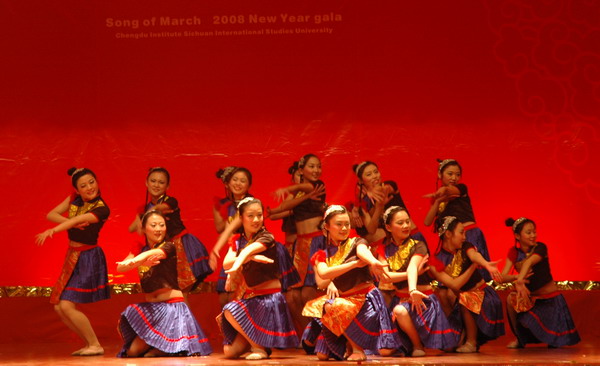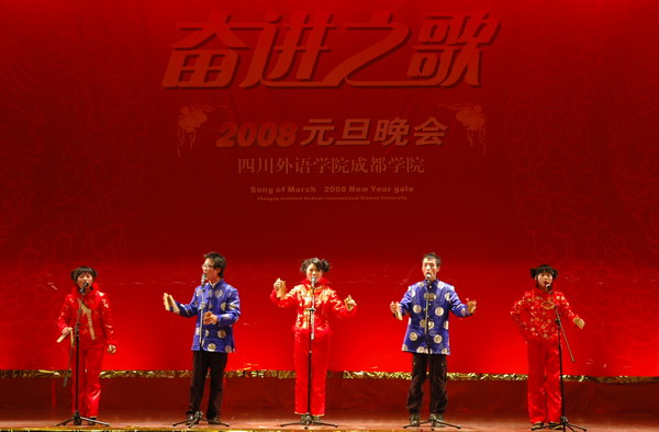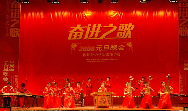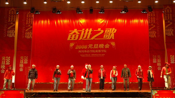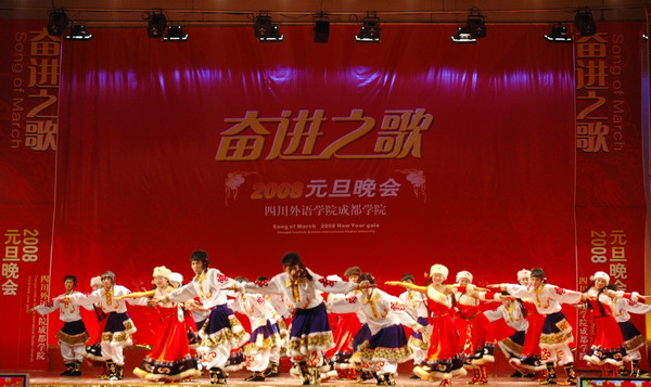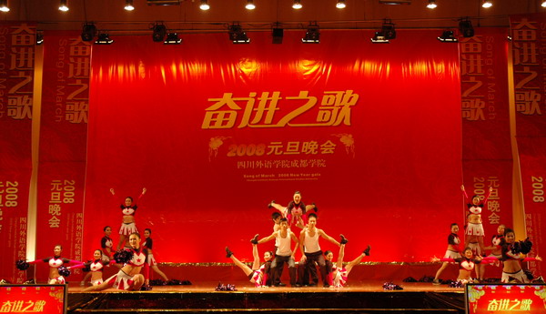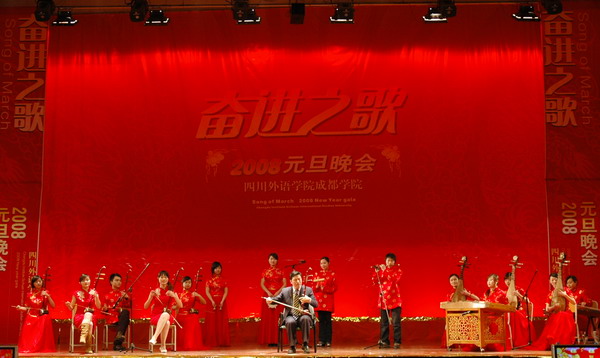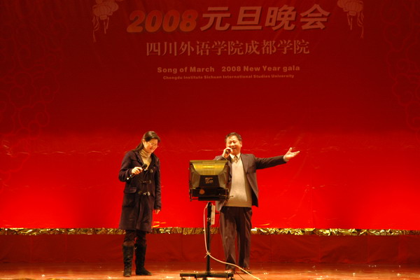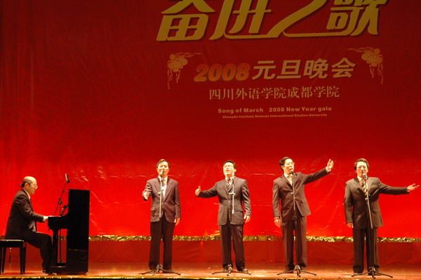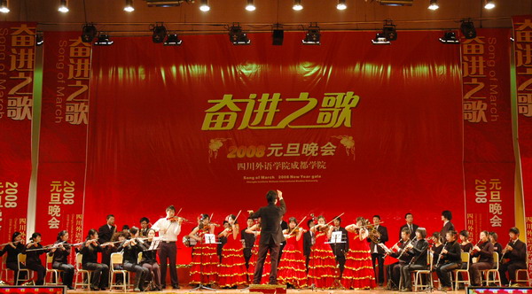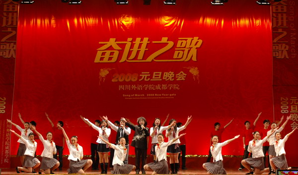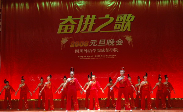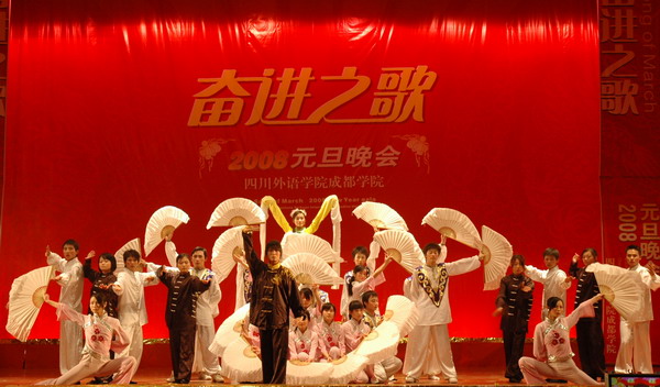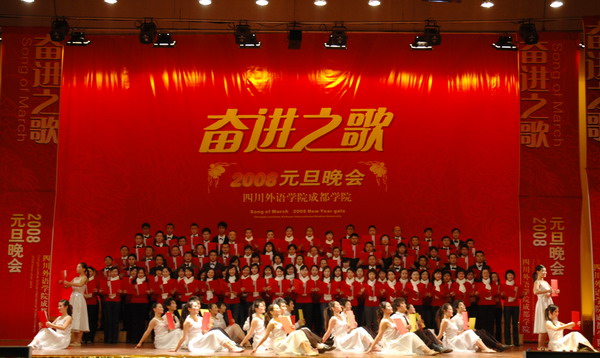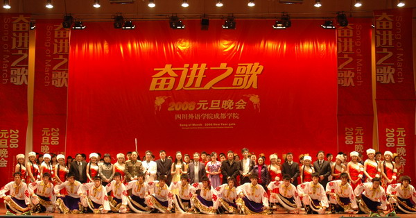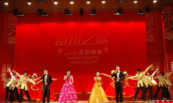 2008年“奋进之歌”元旦文艺晚会在多功能大厅隆重举行。四川外语学院副院长王鲁男教授、党委副书记雷莹教授,四川德瑞企业发展有限公司总经理叶家郁先生,成都军区战旗文工团副团长、国家一级编导范和平大校,四川外语学院开云体育世界杯中国官方网站