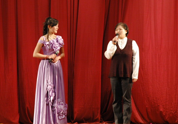 党委书记、院长尹大家教授,四川外语学院学生处副处长兼团委书记张季菁同志合唱歌曲《西沙,可爱的家乡》