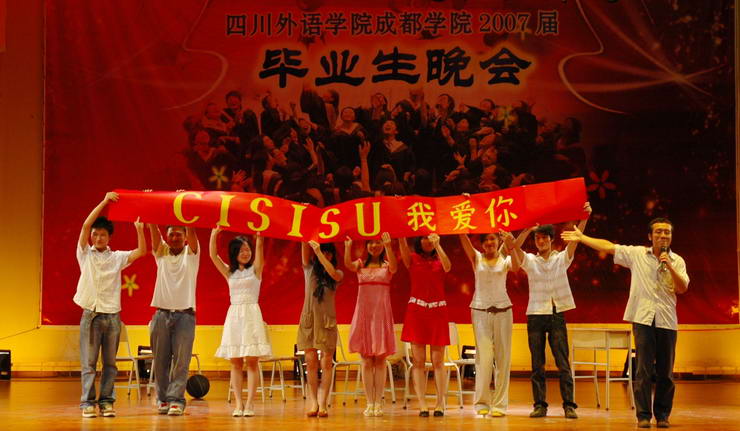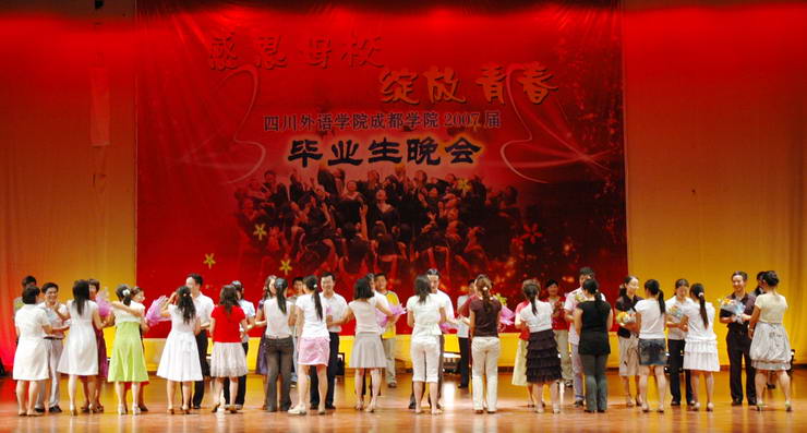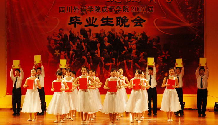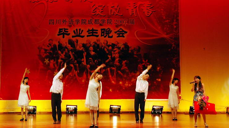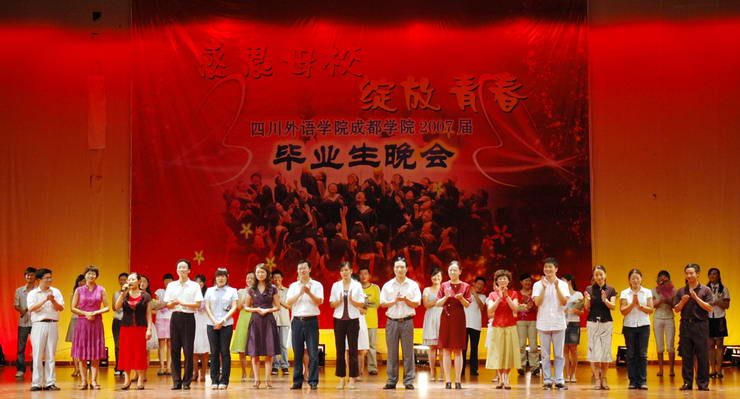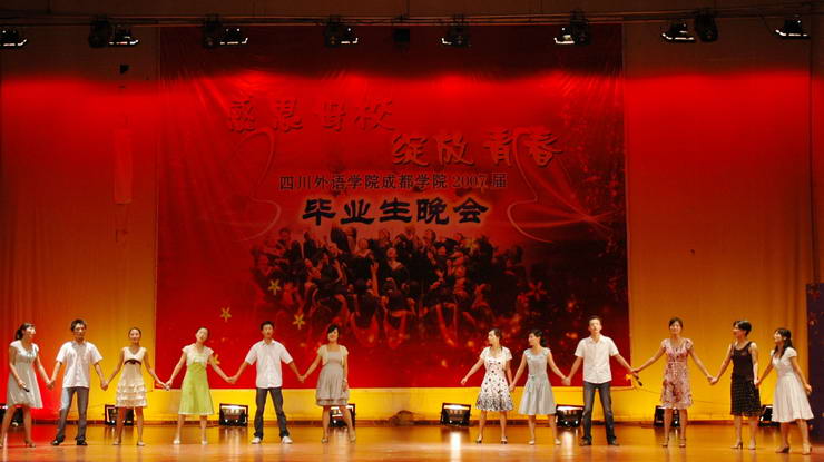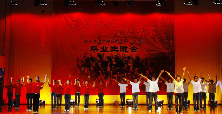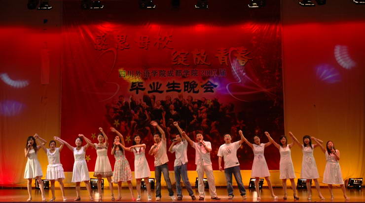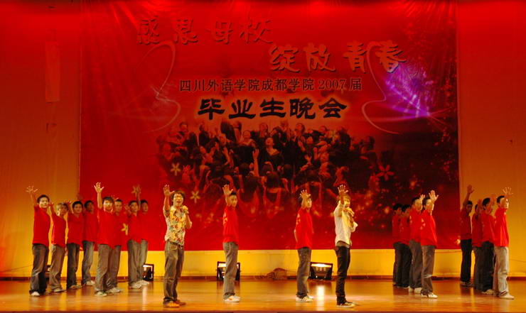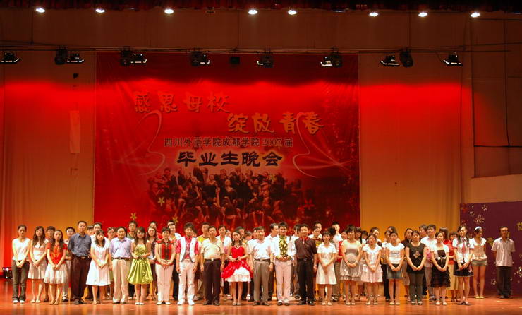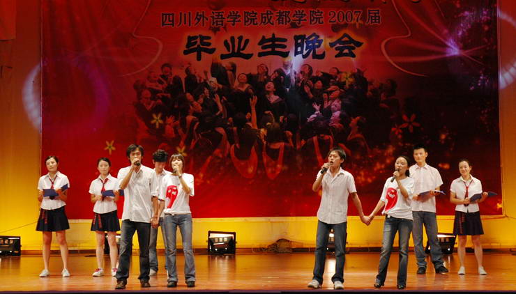 晚会开始前,学院老师通过VCR表达了对2007届毕业生的热烈祝贺和良好祝愿。晚会在大学生艺术团表演的《独立学院之歌》中拉开帷幕。英语经贸系毕业生表演了小合唱《青春的梦想》,表达了对美好青春时光的赞美;英语师范系表演的音乐剧《萍聚》,用动感的歌声和生动的剧情将快乐的大学生活一一呈现;大学生艺术团表演的相声《我的大学生活》,诙谐幽默,赢得了现场观众的阵阵掌声;英语外事管理系表演的舞蹈《律动的青春》,活力四射,充分展现了我院学子朝气蓬勃的青春风采;英语经贸系表演的三句半《大学情》,用大家喜闻乐见的艺术形式妙趣横生地描绘了大学生活;英语外事管理系毕业生表演的诗歌朗诵《启程》,表达了毕业生临别的依依不舍和对未来的美好憧憬;英语翻译系表演的歌舞《JUST ONE LAST DANCE》,用深情的歌声倾诉了青春时光的浪漫情怀;日语系西班牙语系同学表演的形体小品《一个人的一天》,惟妙惟肖地演绎了投身社会后的艰辛和无奈;英语旅游系表演的情景剧《毕业留言薄》,用一幕幕快乐的校园生活剧情,表达了对校园生活的无限怀念和对老师辛勤教诲的无限感激;英语经贸系表演的歌舞《众人划浆开大船》,展现了我院学子团结、奋进的良好风貌;英语翻译系表演的诗歌朗诵《回首四年》,情真意切、感人肺腑地描述了对大学生活的怀念和对美好未来的向往。晚会中,毕业生代表通过VCR表达了对母校培育的感激之情和对母校蓬勃发展的良好祝愿。党委书记、院长尹大家教授也登上舞台,用激昂的歌声向2007届毕业生致以美好的祝福。晚会最后,全体毕业班辅导员老师走上舞台,饱含深情地向2007届毕业生致以诚挚的祝愿。在《感恩的心》的优美旋律中,毕业生代表将手中的鲜花献给敬爱的老师,表达了对老师深切关怀和殷殷教诲的由衷敬意。