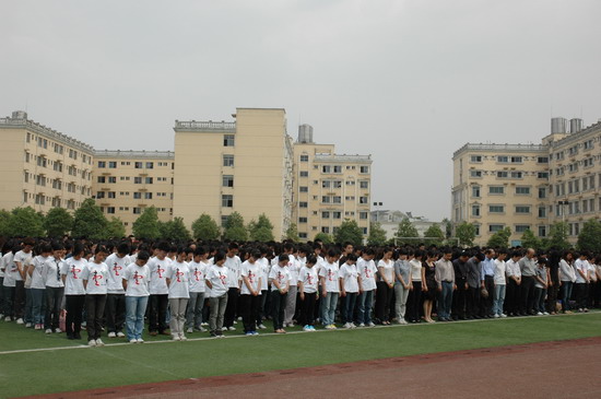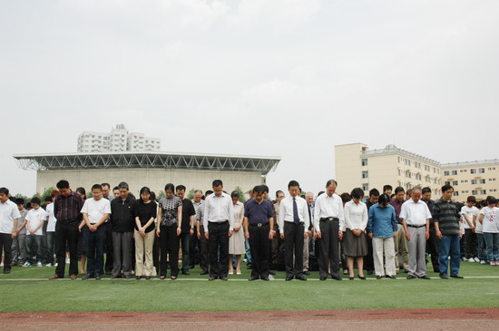 14点28分,全院师生静默肃立,为在地震中遇难的同胞默哀一分钟。现场一片肃静,万人垂首,深切缅怀,沉重哀悼。