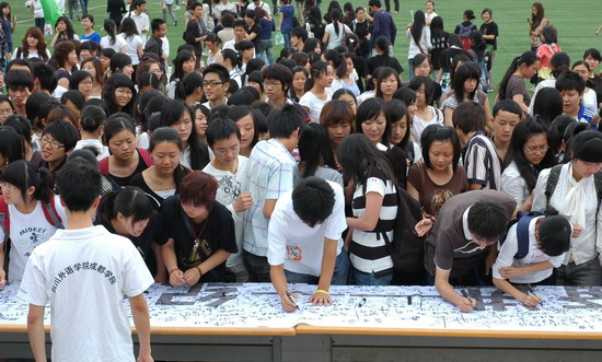 学院师生在“深切缅怀,真诚感恩,携手奋进——纪念5.12汶川大地震一周年”的横幅上签名