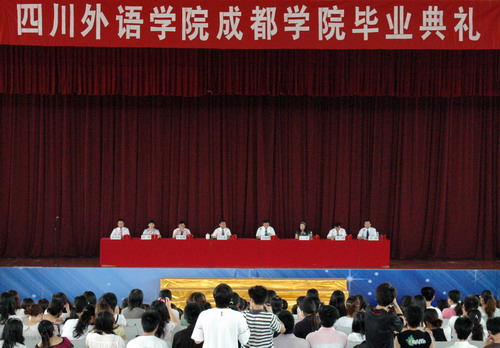 6月23日上午,我院2009届毕业生毕业典礼在多功能大厅隆重举行。四川外语学院副院长王鲁男教授,四川德瑞企业发展有限公司总经理叶家郁先生,四川德瑞教育集团总经理王小英女士,我院党委书记、院长尹大家教授,党委副书记、副院长李泽同志,副院长何英副教授,副院长李葵同志,院长助理张华春同志等领导出席毕业典礼。各部门、系负责人和教师、在校生代表、毕业生家长代表参加了毕业典礼。毕业典礼由李葵同志主持。