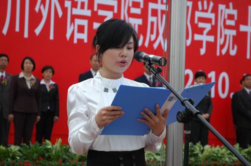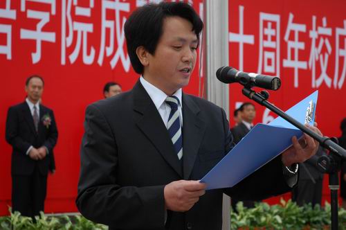 院长助理张华春同志代表校庆组委会,介绍了校庆的组织机构。学院工会组织委员江伟强老师、院学生会主席李佳莹同学分别宣读了倡议书,倡议全院师生积极参与校庆筹备和校庆活动,为校庆的圆满成功,为学院发展再上新台阶,作出最诚挚的努力和最无私的贡献。教师代表、英语翻译系乐大艳老师在发言中自豪地回顾了与学院一同成长的历程,用亲身经历介绍了学院十年来取得的发展和成就。学生代表、英语外事管理系蒋皎婧同学向十年来为母校建设发展做出贡献的领导、老师和历届校友致以崇高的敬意,并表示要带上深情感激,用不懈的努力和优异的成绩,当好学院精神的传承者和弘扬者。