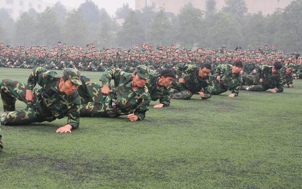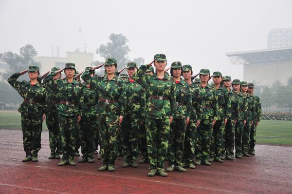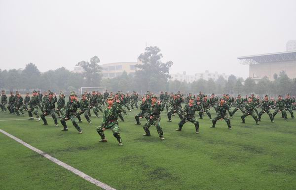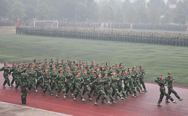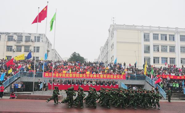 庄严的升旗仪式拉开了开学典礼暨军训结业仪式的帷幕。尹大家院长在部队教官的陪同下,检阅了2011级军训新生。随后,在《分列式进行曲》的激昂旋律中,2011级新生军训方队依次走过主席台,用整齐的步伐、嘹亮的口号展示了蓬勃的朝气。在队列、军体拳、战术演练等训练科目的表演中,同学们动作利落,精神抖擞,尽显威武风采。由100名女生表演的花样列队更是精彩纷呈,同学们一边唱着军歌,一边列出“五星、2011、十年、川外、CISISU”等图形,赢得了全场热烈的掌声。