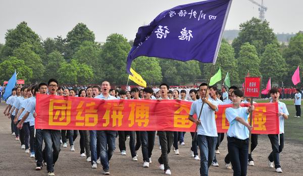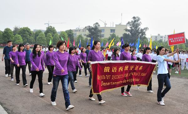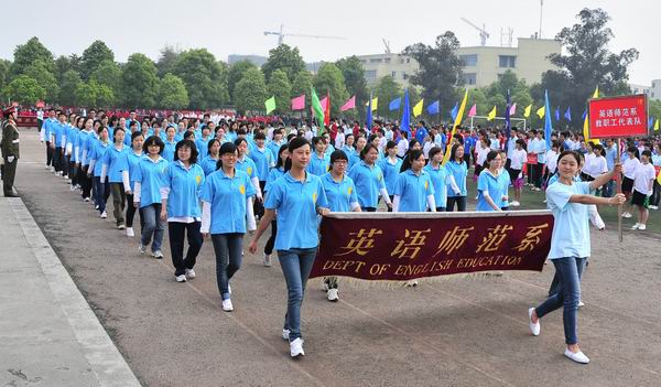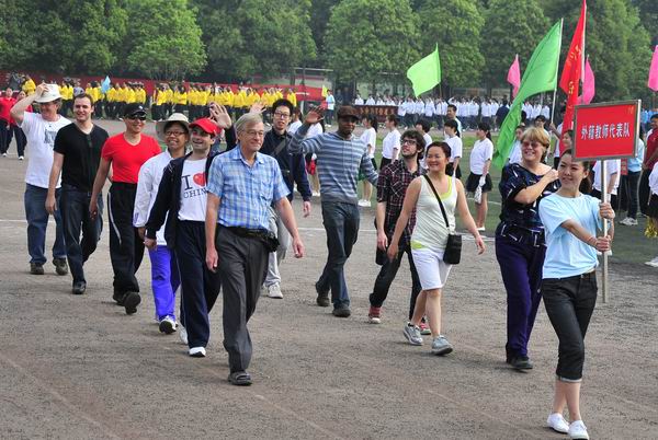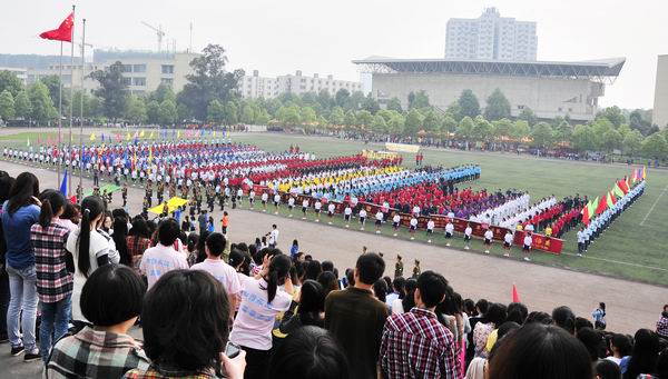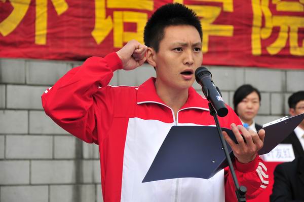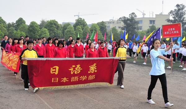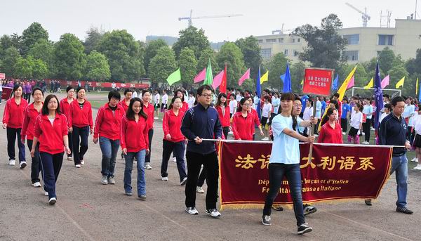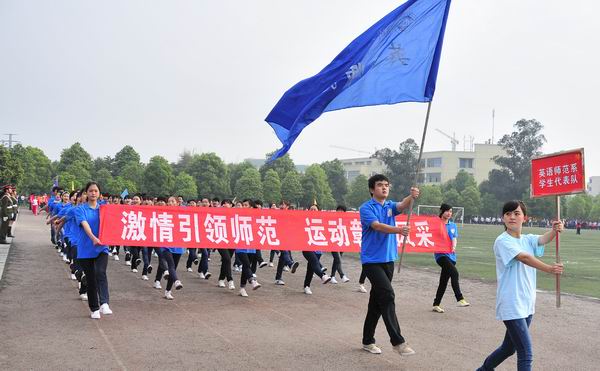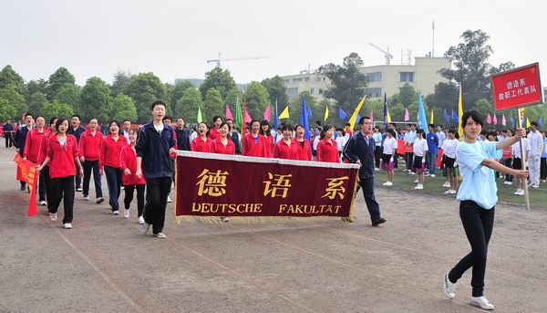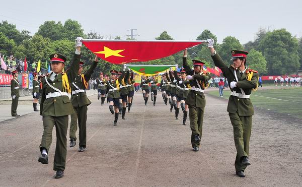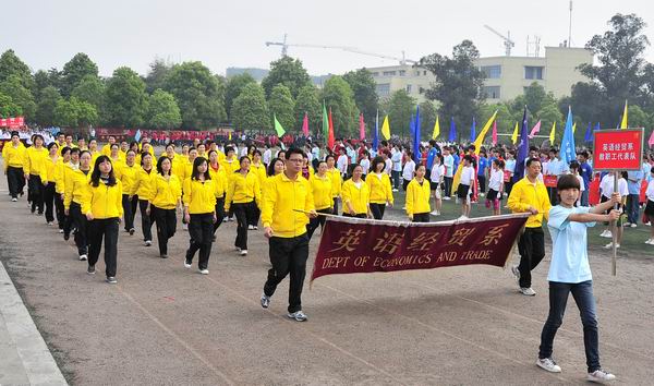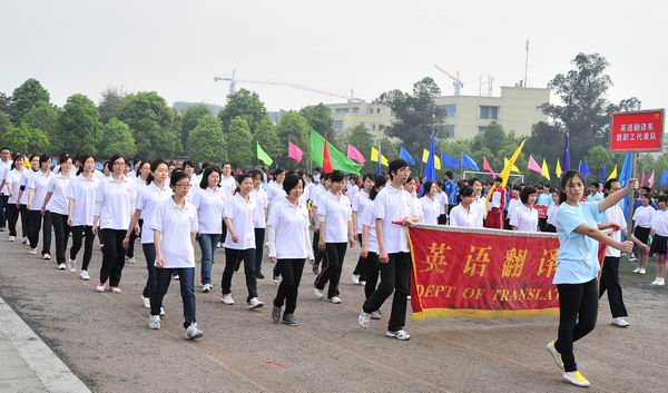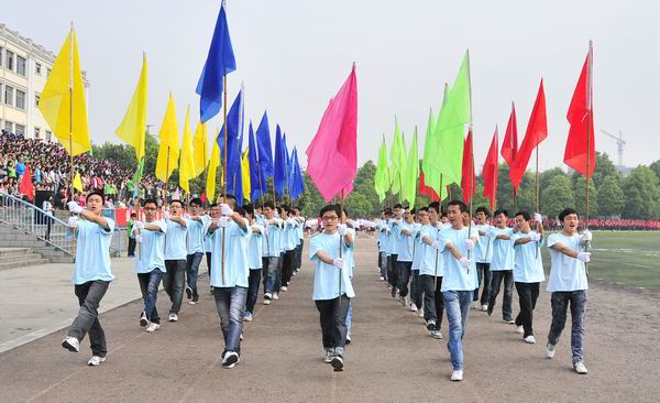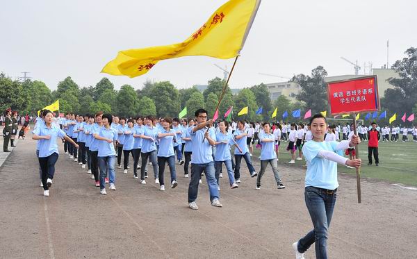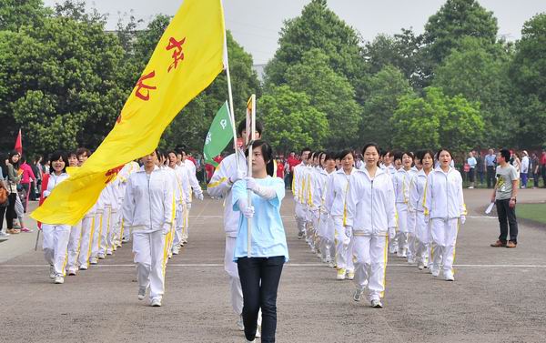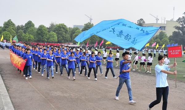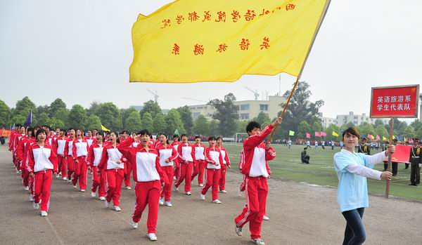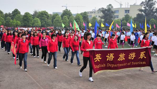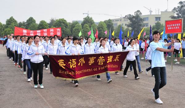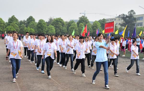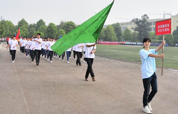 伴着激昂的旋律,春季运动会入场式首先举行。在国旗、校旗、会旗的引领下,标语队、彩旗队、鲜花队和各学生代表队、教职工代表队以及外籍教师、裁判员依次入场,师生们精神抖擞、口号嘹亮,充分展现了积极参与全民健身的良好风采。随后,党委书记、院长尹大家宣布第十届春季运动会开幕。本届春运会组委会副主任、副院长何英代表学院党政和春运会组委会致开幕词,她向本届春季运动会的召开表示了热烈祝贺,希望师生秉承重在参与、锻炼身体、增强体魄的宗旨,把春季运动会办成团结、拼搏、文明的盛会。英语旅游系学生罗瑶、体育部教师周敏分别代表运动员、裁判员宣誓,他们表示将尊重并遵守运动会的各项规则,以真正的体育道德精神参加本届运动会。