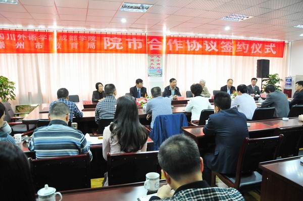 尹大家院长介绍了我院的办学情况和外语特色,他表示,我院一贯重视凭借外语专业优势,服务地方经济发展,促进地方教育事业,此次和崇州市教育局携手合作,我院一定会充分发挥外语教学和外语资源优势,努力帮助崇州市的外语教学水平再上新台阶。刘荣华副市长对我院与崇州市教育局签订教育合作协议表示了热烈欢迎,她说,在双方共同努力下,崇州市的外语教育必将更加辉煌。
