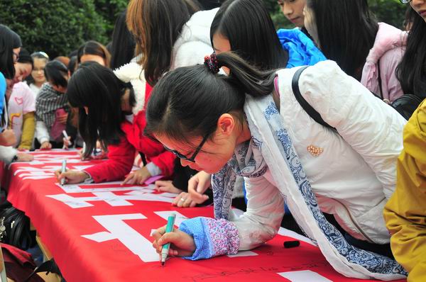 同学们在“增强安全意识 创建平安和谐校园”横幅上签名