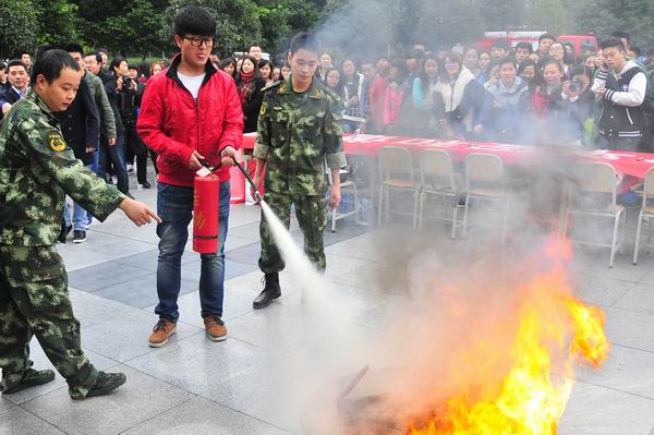 11月7日中午,学院保卫处在口语角广场举行了消防演练活动,都江堰市消防大队官兵和公安局民警现场为师生介绍了安全防范知识和消防器材的使用方法,并指导同学们使用灭火器进行了消防演练。现场还开展了“增强安全意识 创建平安和谐校园”签名、安全知识宣传展览、消防知识宣传单发放等活动,让师生进一步了解了各类安全知识。