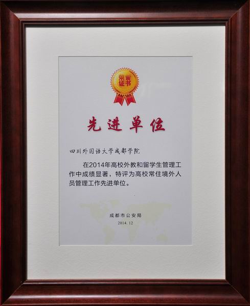 日前,成都市公安局召开了涉外高校管理工作会议,表彰了涉外管理工作的先进单位和个人。我院出色的国际合作与交流工作、规范的外事管理工作赢得了广泛好评,被评为2014年度“高校常住境外人员管理工作先进单位”,国际合作与交流处李腾阳老师荣获“高校常住境外人员管理工作先进个人”称号。