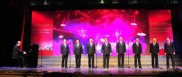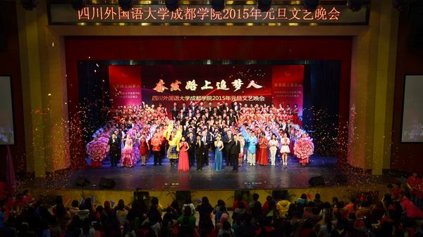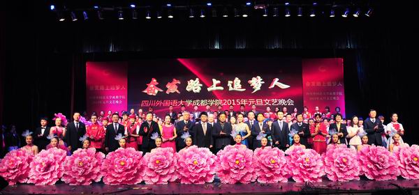 12月29日晚,“奋发路上追梦人”元旦文艺晚会在观澜堂举行,掀起了庆典活动的最高潮。四川外国语大学党委书记明国辉,四川德瑞企业发展有限公司总经理、学院董事会董事叶家郁,四川外国语大学副校长王鲁男,我院党委书记、院长尹大家,副书记、副院长李泽,副院长何英,副院长李葵,副院长俞永康,副书记张华春等领导和各部门、系负责人以及师生代表欢聚一堂,观看了精彩的文艺晚会。