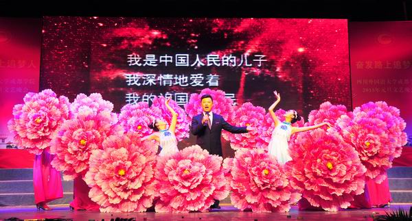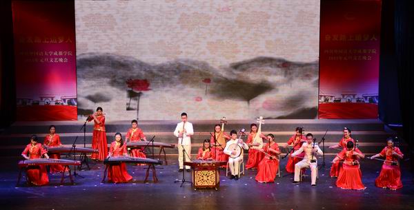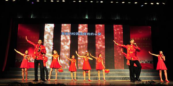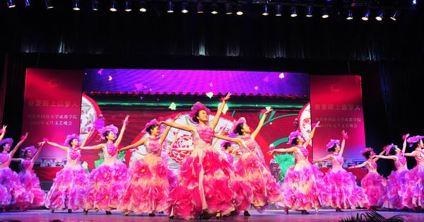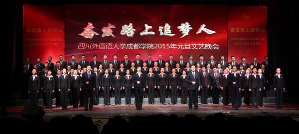 奋发追梦育桃李,锐意进取谱新篇。师生们带着收获喜悦和真诚祝福,表演了精彩纷呈的节目。由东方语系和英语旅游系的同学们表演的开场舞《共圆中国梦》,欢快热烈,表达了美好的新年祝福;教师艺术团80多名教师倾情投入,带来了音诗画《独立学院之歌》,将我院创作的《独立学院之歌》的产生历程、广泛影响和其承载的学院情怀、对师生的感召等内容一一讲述,让现场观众深受感动;英语经贸系和体育部师生表演的武术《追梦》,学生艺术团表演的舞蹈《春来了》,航空项目部表演的礼仪秀《放飞梦想》,展现了师生奋发向上的良好风采;由教学名师带来的我院原创歌曲征集大赛优秀作品《我愿一生站在讲台上》,真挚感人,倾诉了广大教师矢志教育、育人教书的心声;学生艺术团表演的民乐《步步高》、管乐《匈牙利舞曲》,旋律欢快,表达了对学院和师生的良好祝愿;教师艺术团带来的男声小合唱《乘着歌声的翅膀》和《共筑中国梦》,展现了老师们德艺双馨的出色风采;全体外籍教师演唱的歌曲《When a Child is Born》西方文化色彩浓厚,俄罗斯、韩国、哈萨克斯坦留学生演唱的歌曲《茉莉花》、《你是我的CISISU》,中国文化特色鲜明,展现了我院国际交流的成果和中外文化的精彩交融;由翻译系、文化传媒系组织的诗朗诵《我是川外开云体育世界杯中国官方网站 人》,体现广大学子热爱学院、以院为荣的情感共鸣,特别是2010届毕业生、现在美国佐治亚州立大学攻读博士的殷跃同学,不远万里,从美国回到母校参加演出,让现场观众深受感动;由德语系、俄语西班牙语系组织,朱波老师演唱的歌曲《为什么我总是想起你》,表达了对邓小平同志的尊敬和怀念;由英语外事管理系、法语意大利语系组织的多语种诵读《习近平总书记寄语青年》,同学们用11门外语演绎了习近平总书记对青年的殷切期望,充分体现了我院的外语特色;由学生艺术团带来的男子舞蹈《阳光康巴》,激情而热烈,展现了同学们的青春风采。最后,晚会在全场师生高唱《前进吧,川外开云体育世界杯中国官方网站 》的激昂歌声中圆满落下帷幕。