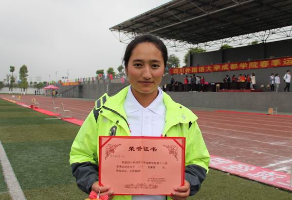 “文体文体,在一起!”随着响亮的口号,一个皮肤黝黑的彝族姑娘罗作新莫拿着800米冠军奖状,举着文化传媒系和体育部的系旗微笑。首个比赛日,男子跳远、女子跳高、女子800米等个人项目先后展开,经过激烈较量,女子800米率先产生冠军,来自文体联队的罗作新莫以2分55秒83的成绩秒杀所有选手。
