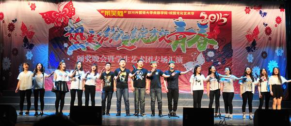 晚会首先进行的是颁奖环节。在舞蹈大赛、绘画比赛、中文影视配音大赛、手工艺品制作大赛、书法比赛、主持人大赛、摄影比赛等活动中获奖的同学们依次登台领奖。英语外事管理系团总支、英语旅游系团总支和俄语西班牙语系团总支在本届校园文化艺术节期间广泛动员,高效组织,获得了“最佳组织奖”。