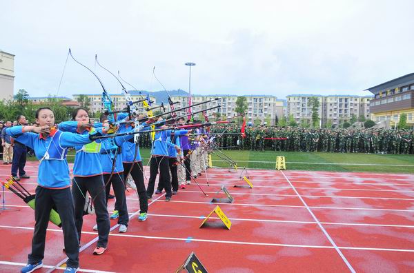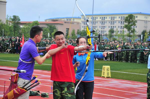 与奥运冠军张山零距离接触,聆听她讲解运动精神;观看射箭对抗赛,亲身体验射箭运动的魅力……为了让2015级新生以更加良好的精神面貌投入军训,取得优异的军训成果,9月18日,我院为2015级新生带来了一场精彩的运动盛宴——巴塞罗那奥运会双向飞碟射击冠军、四川省陆上运动学校校长张山率成都市射击运动学校师生一行来到我院,为新生们开展了射箭项目进校园活动。