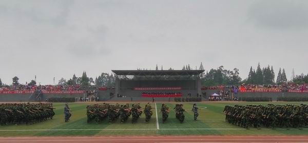 9月29日下午,我院2015级新生开学典礼暨军训结业仪式在运动场隆重举行。学院党委书记、院长尹大家,承训部队副司令陈炳伟,学院常务副院长杨继瑞,副书记、副院长李泽,副院长何英,副院长李葵,副院长俞永康,副书记张华春等领导出席。各部门、系负责人,全体2015级新生以及学院师生代表参加了典礼。