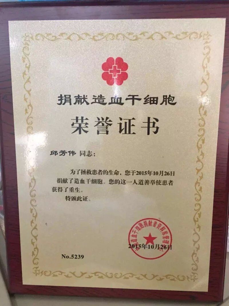 “对于自己来讲,也许只算是小小的付出,但对于受助者而言,却是一个家庭的全部希望。”为顺利完成二次配型和成功捐献,邱芳伟在初次配型后,坚持每天锻炼身体,增强体质,做好准备。由于非血缘关系的人群中配型相合的概率极低(1/400-1/10000),所以在邱芳伟看来,能用自己的干细胞挽救他人的生命,输出生命的“活力种子”是一件很幸运的事。
