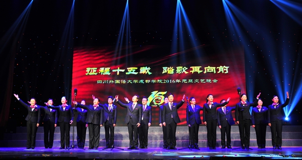 12月30日晚,“征程十五载 踏歌再向前”元旦文艺晚会在观澜堂举行,掀起了庆典活动的最高潮。四川外国语大学党委书记明国辉、校长李克勇,四川德瑞企业发展有限公司总经理叶家郁,四川外国语大学党委副书记张艳,大陆希望集团总裁、中国侨商联合会副会长陈斌,四川译宝公司、成都译采翻译公司总经理秦晓庭,我院党委书记、院长尹大家,副书记、常务副院长杨继瑞,副书记、副院长李泽,副院长何英,副院长李葵,副院长俞永康,副书记张华春等领导、来宾和师生代表、校友代表欢聚一堂,观看了精彩的文艺晚会。