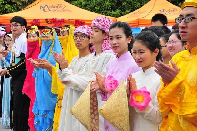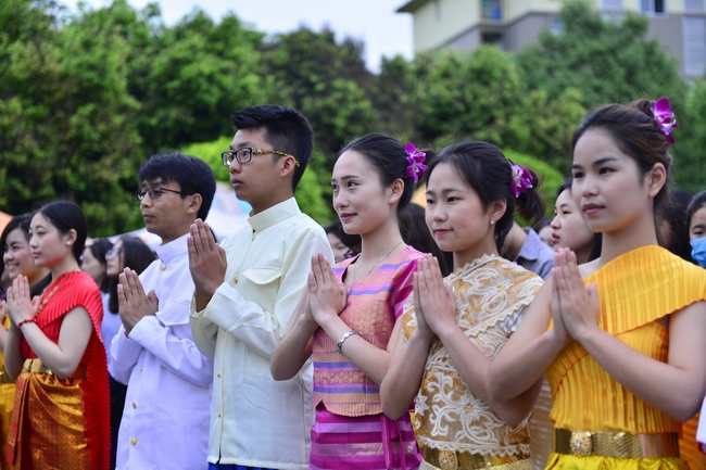 口语角广场的舞台上,同学们身着华丽的朝、泰、越、阿民族传统服饰,跳起了欢快的民族舞蹈,将现场气氛推向了高潮。