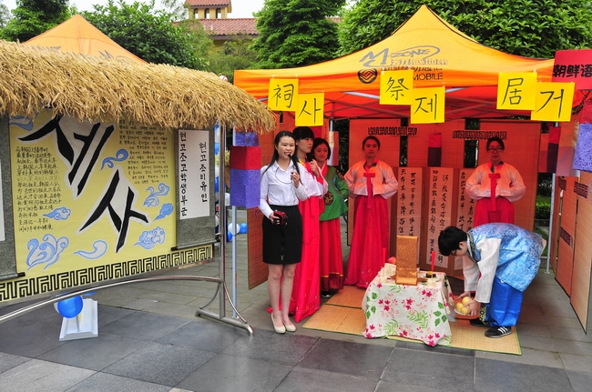 在泰语A组展台,泰语专业学生展示了充满浪漫色彩的水灯节庆祝仪式;在阿拉伯语4组展台,阿拉伯语专业学生搭建起“阿拉伯语直播台”,详细介绍了阿拉伯也门共和国的特色美食、腰刀、服饰和风景建筑;在越南语B组展台,越南语专业学生现场演示了越南传统的茶道文化和饮茶习俗;在朝鲜语5组展台,朝鲜语专业的同学们用巧手制作了一件件精美的房屋建筑,展示了不同时期的村落建筑造型和居住文化。“这些村户模型都是我和小伙伴们花了很长时间,用麻绳和筷子一件一件编制而成的”,2015级朝鲜语5班的李钰阳说,“为了更好地展示朝鲜语专业文化,我们还手工制作了绘有朝鲜族服饰的卡片、画扇分发给现场观众。”
