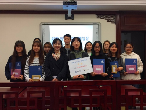 在前两届外国人韩语写作大赛中,我院学子成绩突出,不仅蝉联了金奖,还囊括了赛事的大部分奖项。今年,我院朝鲜语专业学子凭借出众的实力,再创佳绩,其中,2014级的顾迪尔荣获金奖,梁君获银奖,吴倩、杨梓婷、梁熳铃、诸晓甜获铜奖,徐文捷、刘敬伊、樊倩、郑宇婷、黄椀汐获入围奖。