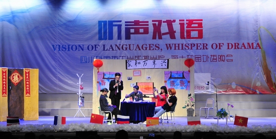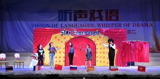 本届外语晚会以“听声戏语”为主题,经过各系精心推选,共有10个优秀节目入围,涉及英语、日语、朝鲜语、意大利语、西班牙语、葡萄牙语、泰语、俄语等语种。晚会中,同学们用流利的外语和各具特色的现场表演,带来了精彩纷呈的节目,充分体现了同学们出色的外语水平和多才多艺的风采,特别是节目中对中外经典的创新演绎、对社会热点的真切关注、对传统美德的大力弘扬,赢得了现场师生的一次次热烈掌声。