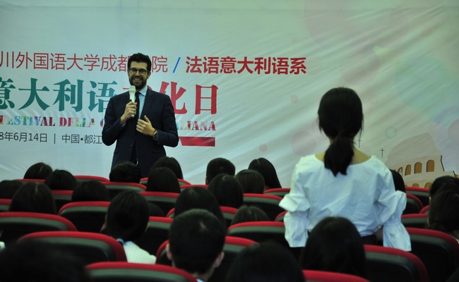 会谈后,Davide Castellani副总领事还参加了我院意大利语文化日活动。我院学生通过歌曲合唱《栀子花开》(意大利语)、电影配音、主题演讲等形式,展示了意大利语的学习成果。在随后的交流中,Davide Castellani副总领事高度评价了我院学生的意大利语水平和热情活泼的精神风貌,希望同学们通过学习意大利语言,了解意大利文化,加强与意大利各界的交流,为促进中意两国的友谊作出贡献。