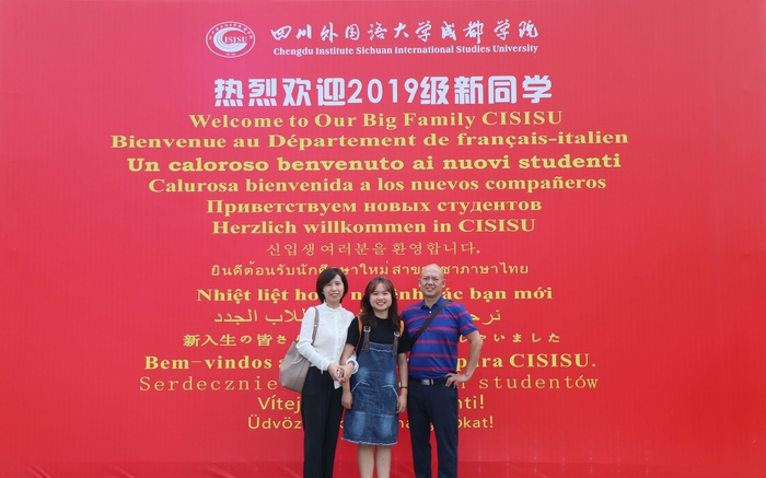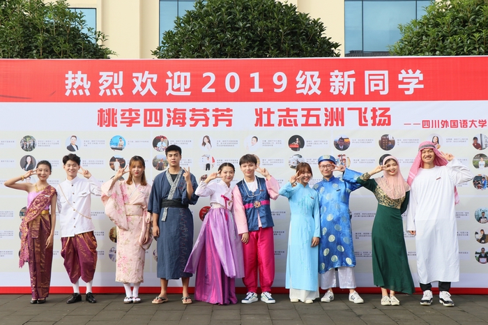 学校在南湖广场设置了15门外语的“热烈欢迎2019级新同学”展板,在校园道路上悬挂了众多外语横幅,在电子显示屏上播放了多语种的专题视频,充分体现了专业外语院校的鲜明特色。