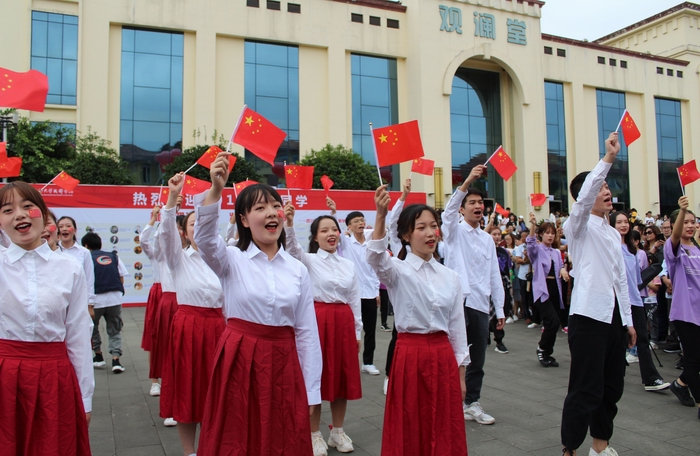 学校团委在迎新现场开展了“青春建功新时代、扬帆起航正当时”主题快闪活动。同学们表演了歌曲、舞蹈、书法、走秀等精彩的节目,吸引了现场新生和家长的驻足观看。活动最后,同学们齐声高唱《我爱你中国》,一起挥舞手中的国旗,向新中国70华诞献礼,现场氛围十分热烈,受到了新生和家长的广泛好评。