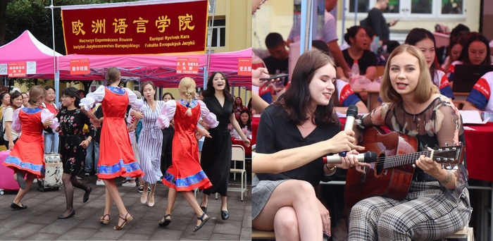 在欧洲语言学院的迎新接待点,来自俄罗斯、哈萨克斯坦的外国留学生们也加入到迎新的队伍,他们在现场跳起俄罗斯舞蹈、弹唱俄罗斯歌曲,向2019级新生表示欢迎和祝愿。