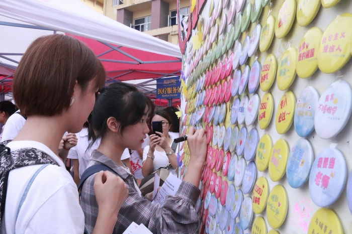 英语学院的“梦想徽章”让人眼前一亮。精心准备的400多个徽章,在展板上拼成了英语学院的英文缩写“SES”,徽章印有“自信乐观”“我爱学习”“人见人爱”“专八必过”“坚持锻炼”“不忘初心”等正能量的话语,新生来到学院,可以选择一个徽章,找到属于自己的大学生活正能量。