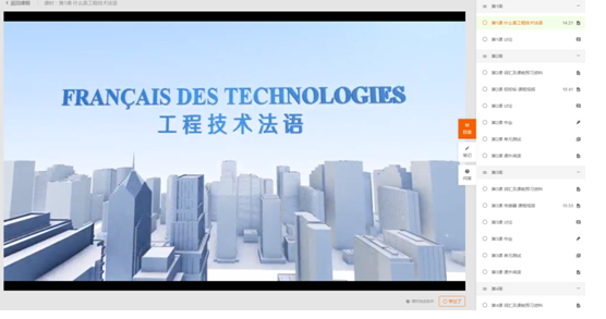 在已经具备较为成熟的课程体系的基础上,学校不断深化教学改革,开展了《工程技术法语》线上线下混合式课程。课程线上部分是为了解决学生在专业领域的知识储备不足的问题,帮助学生进行铺垫和初步了解;线下部分是使用配套教材进行更为深入的专业知识讲解,并将较为专业的课文进行准确翻译。即线上先行,通过视频、主题讨论和练习等环节铺垫工程技术法语背景知识,线下深化行业专业知识,对行业专业文章进行翻译实操。同时,线上课程有效地利用了多媒体手段,能够为学生直观地展示各类专业术语的准确含义,极大地提高学习的效率。