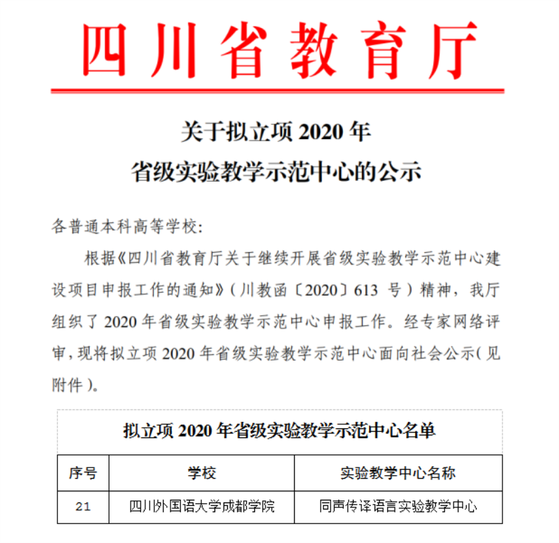日前,四川省教育厅发布了《关于拟立项2020年省级实验教学示范中心的公示》已公示结束,开云APP(中国)官方下载 “同声传译语言实验教学中心”入围立项。