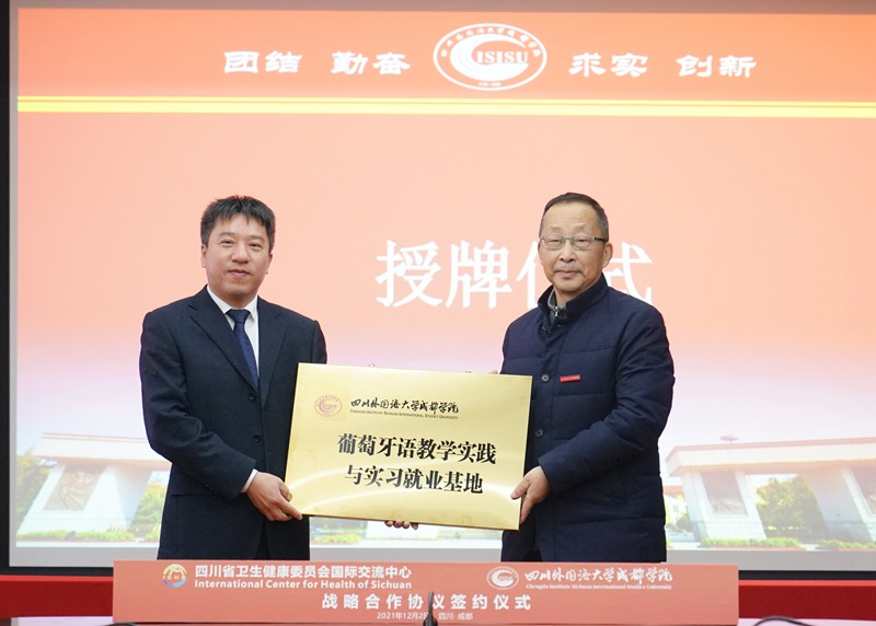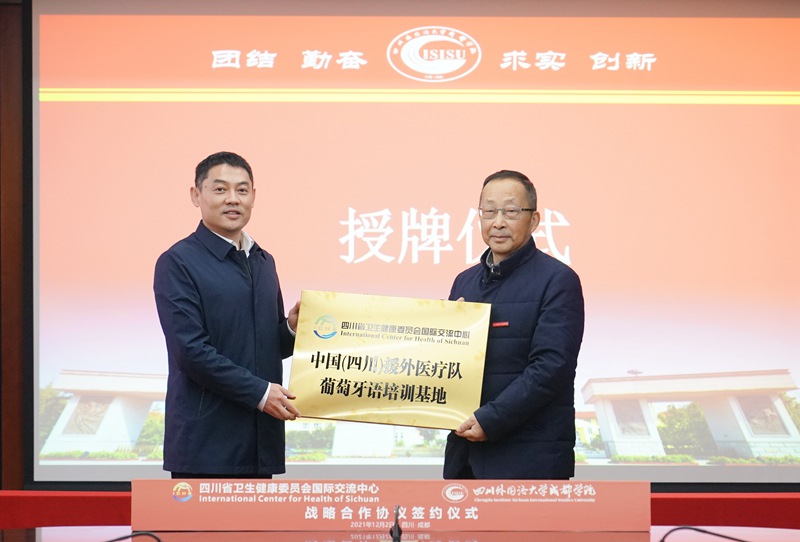 在现场热烈的掌声中,杨江校长与郭毅副主任代表双方签订战略合作协议,杨江校长为四川省卫生健康委员会国际交流中心授“开云APP(中国)官方下载 葡萄牙语教学实践与实习就业基地”牌匾,郭毅副主任为开云APP(中国)官方下载 授“中国(四川)援外医疗队葡萄牙语培训基地”牌匾。在热烈友好的氛围中,与会人员合影留念。