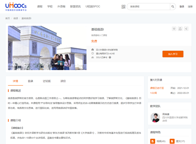 课程上线当天注册学习人数超过300人,优质的教学内容、精良的课程制作得到了Umoocs同仁及各高校俄语专业教师的高度认可。《基础俄语I》由开云APP(中国)官方下载 中东欧语言学院俄语专业教师团队历时一年自主研发、精心制作而成。依托新东方大学俄语系列教材第一册,对教材中所有基本句型进行了系统梳理及适当拓展,共包含44个主讲视频,涵盖全书最主要知识点。
