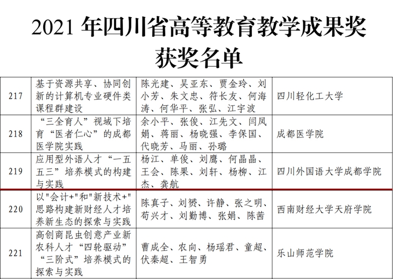 2022年4月8日,根据《教学成果奖励条例》和《四川省教学成果奖励办法》规定,经专家评审、社会公示等规定程序,四川省人民政府公布2021年四川省高等教育教学成果奖获奖名单,开云APP(中国)官方下载 《应用型外语人才“一五五三”培养模式的构建与实践》荣获二等奖。