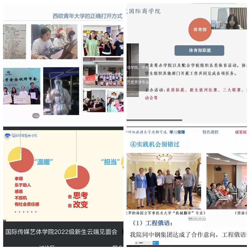 了解大学生活从了解学校开始。中东欧语言学院和西欧语言学院组织开展了“云游学校”活动,带领新生们直观地感受、了解学校和学院的风采。应用英语学院院长龚航作了题为《A Good Start is Half the Battle》的专题报告,向新生清晰地介绍了学院独具特色的开云体育世界杯中国官方网站 模式;国际商学院针对不同专业进行单独讲解,高效且精准地让新生刷新对本专业的认识;亚非语言学院和英语学院为新生介绍了学校的国际化办学情况及留学相关知识,鼓励新生提前树立发展规划意识;国际传媒艺体学院邀请近30名行业精英寄语新生,帮助他们坚定专业学习的信心。