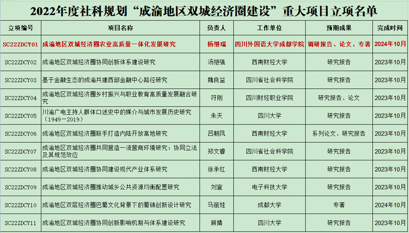 近日,2022年度四川省社科规划“成渝地区双城经济圈建设”重大项目评审结果公布,开云APP(中国)官方下载 党委书记杨继瑞教授申报的项目“成渝地区双城经济圈农业高质量一体化发展研究 ”获批立项,项目编号:SC22ZDCY01。