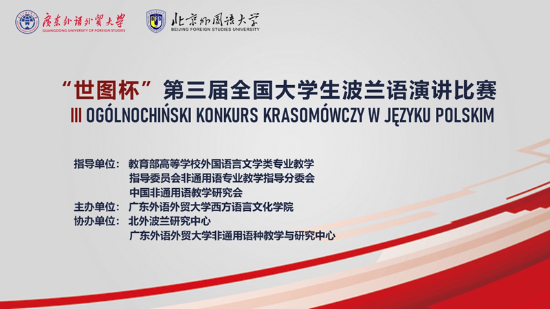 全国大学生波兰语演讲比赛是国内波兰语界规模最大、最重要的大学生学科竞赛,由行业和各高校副高职称或博士学位以上人员担任评委工作。本届比赛由广东外语外贸大学西方语言文化学院主办,北外波兰研究中心、广外非通用语种教学与研究中心协办,经过初选,来自16所国内高校的波兰语专业本科生进入全国决赛。