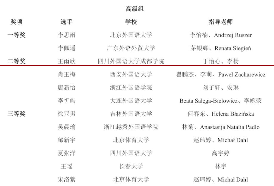 高级组比赛分为命题演讲和即兴演讲两个环节。在中东欧语言学院教师丁怡心和李杨的指导下,王雨欣在命题演讲中围绕题目《波兰语在中波文化交流中的作用》,从当今社会文化交流的重要性切入,通过讲述学习波兰语的经历、比较中波文化间的异同,阐释了波兰语在中波文化交流中的重要性,并呼吁波兰语专业学子应当明晰责任与使命,学好专业,推动两国文化交流。即兴演讲环节中,王雨欣的演讲题目为《网络时代如何保护个人信息?》,她紧扣题目,从多方面展开论述,展现出扎实的语言水平、稳健的演讲风格和极强的应变能力。经过激烈角逐,高级组比赛最终评出一等奖2人,二等奖4人,三等奖6人,优胜奖2人,王雨欣以第三名的成绩荣获高级组全国二等奖。