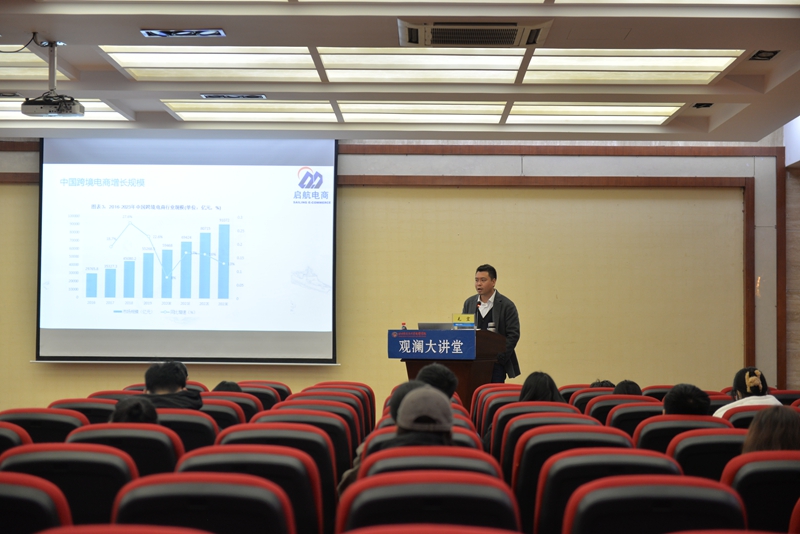 毛宏有着丰富的跨境电商行业经验,他在2012年开始独立运营Chinabuye跨境电商,营业额超1000万,2014年创建了深圳应天科技有限公司,在亚马逊电商平台创办多个热销品牌,帮助数十家工厂成功转型涉足跨境电商自有品牌业务。毛宏围绕跨境电商的兴起背景、行业特色、从业人员构成等多方面,全方位地向同学们介绍了这个行业的历史和发展趋势。他将跨境电商的发展比作新时代的“淘金热”,呈现出欣欣向荣的态势,能够带动工业、服务业等相关产业的发展,对中国未来的发展起着重要的推动作用。毛宏指出,跨境电商是一个复合型、年轻化的行业,作为“00后”的同学们生逢其时,肩负着销售好中国产品、打造中国品牌、提升中国产品附加值等使命;外语学子与这个行业也有着极高的契合性,同学们要发挥外语这项核心优势,在大学中要有意识培养自己的复合型能力,学习跨学科、跨行业知识,增强自身竞争力。最后,毛宏还向同学们介绍了校内跨境电商实训基地的工作内容,并鼓励同学们积极实习、实操。