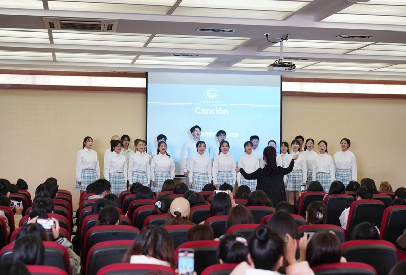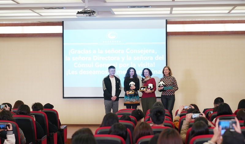 随后,奥乔亚参赞一行来到学术报告厅参加西班牙语专业举办的“西班牙语文化日”活动,同学们以热烈的掌声迎接来宾,并精心准备了西语独唱、朗诵、演讲等节目,展现西语学习成果以及对专业的热爱,同时为参赞一行送上了极具四川特色的熊猫玩偶、印章等礼物。奥乔亚参赞表示,西班牙语是世界第二大语言,正在发挥着越来越大的作用,很高兴同学们选择以西班牙语作为专业,祝愿同学们学好西语,有机会到西班牙深造。塞韦拉院长向同学们介绍了塞万提斯学院有着丰富的线上线下资源,希望同学们对这些资源加以利用,积极考取西班牙语水平证书,在西语学习路上不断深入前进。